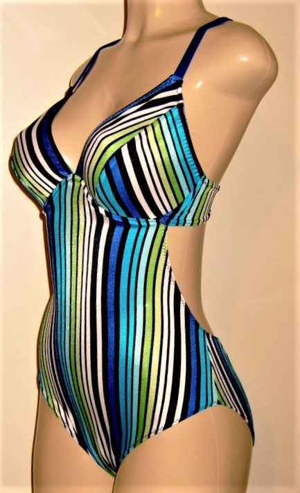 V-neck one piece swimsuit with underwire support. Great style for fuller busts. Covered tummy and cutaway body at sides and back. While front is conservative, the back is sexy. Moderate leg coverage. Can be made for long and short torso. Top part is a constructed top with fabric and lining. No pads or cups.